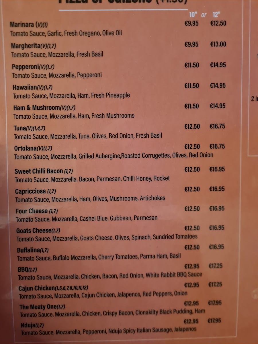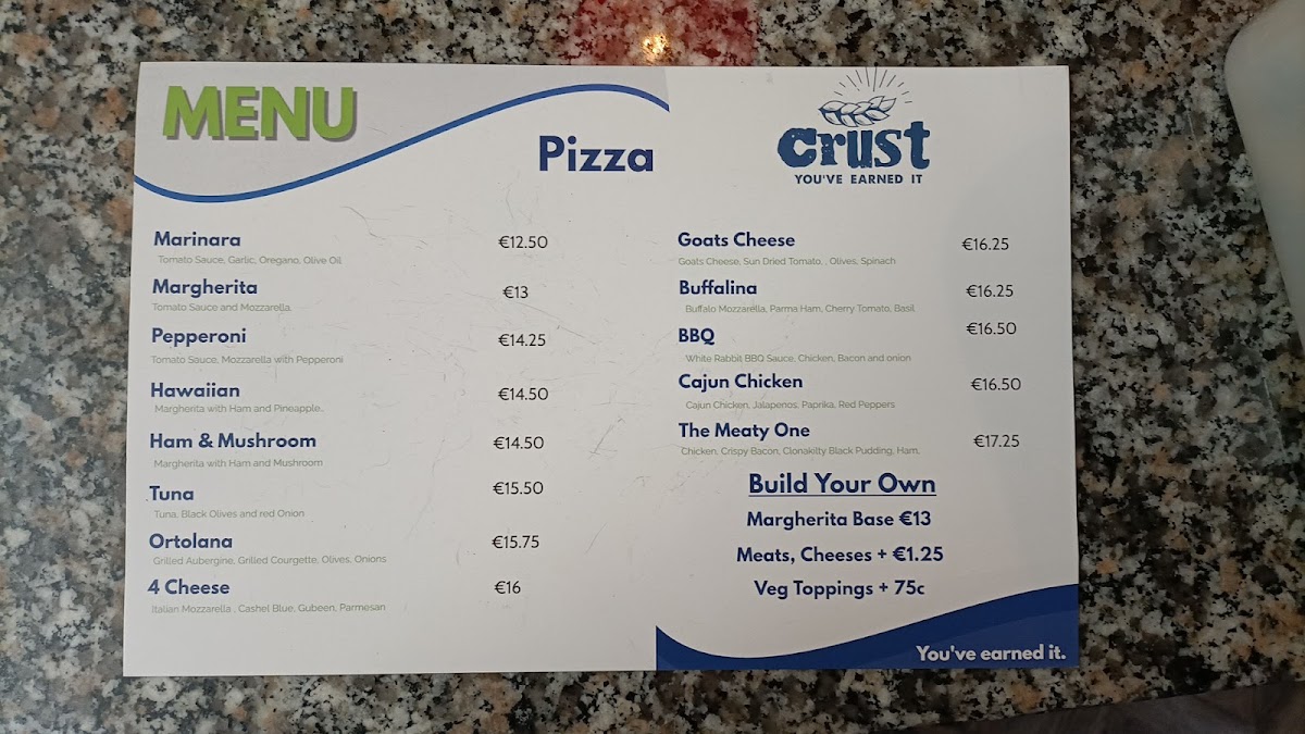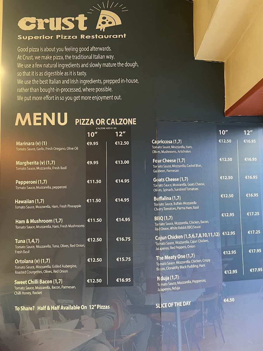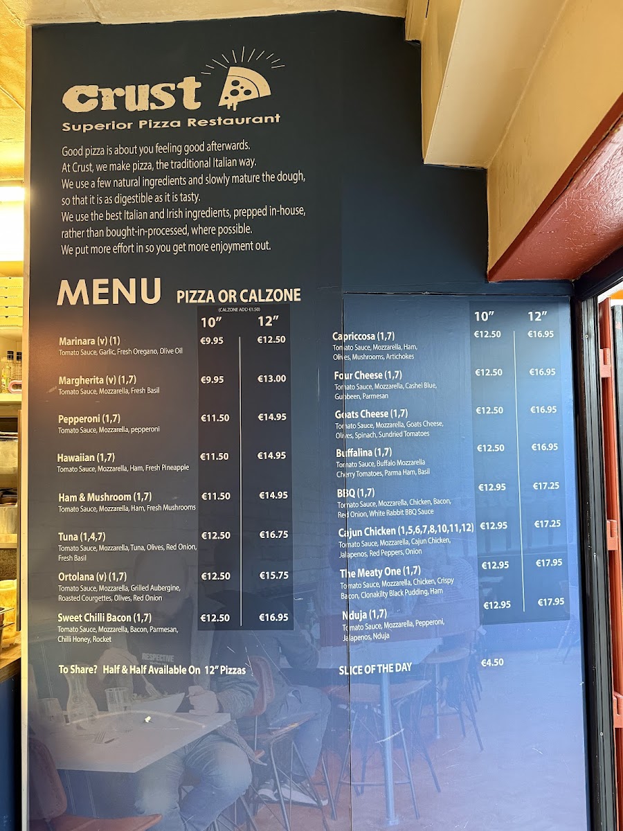 Crust Cork offers a delightful variety of dishes that perfectly blend traditional and contemporary flavors, making it a must-visit spot for anyone in Cork. Among the highlights of their menu, the Sweet Chili Bacon stands out as a deliciously savory treat with a perfect balance of sweetness and spice, making it an ideal starter. For pizza lovers, the 12 Inch Margarita Pizza and Margherita Pizza are both fantastic choices, with the latter offering a classic, comforting flavor of fresh tomatoes, mozzarella, and basil on a perfectly baked crust. The Chicken and Pesto Pizza provides a flavorful twist with tender chicken paired with the rich, aromatic pesto sauce that elevates the dish to another level. Additionally, the Tuna Black Olive and Red Onion pizza offers a savory combination that brings together the tangy tuna with the boldness of black olives and onions. For those who enjoy a sweet and comforting drink, the Macchiato is a wonderful coffee choice, perfect for a post-meal treat or a mid-afternoon pick-me-up. Overall, Crust Cork’s menu offers an impressive selection, with each dish crafted to satisfy various tastes, ensuring that there is something for everyone.